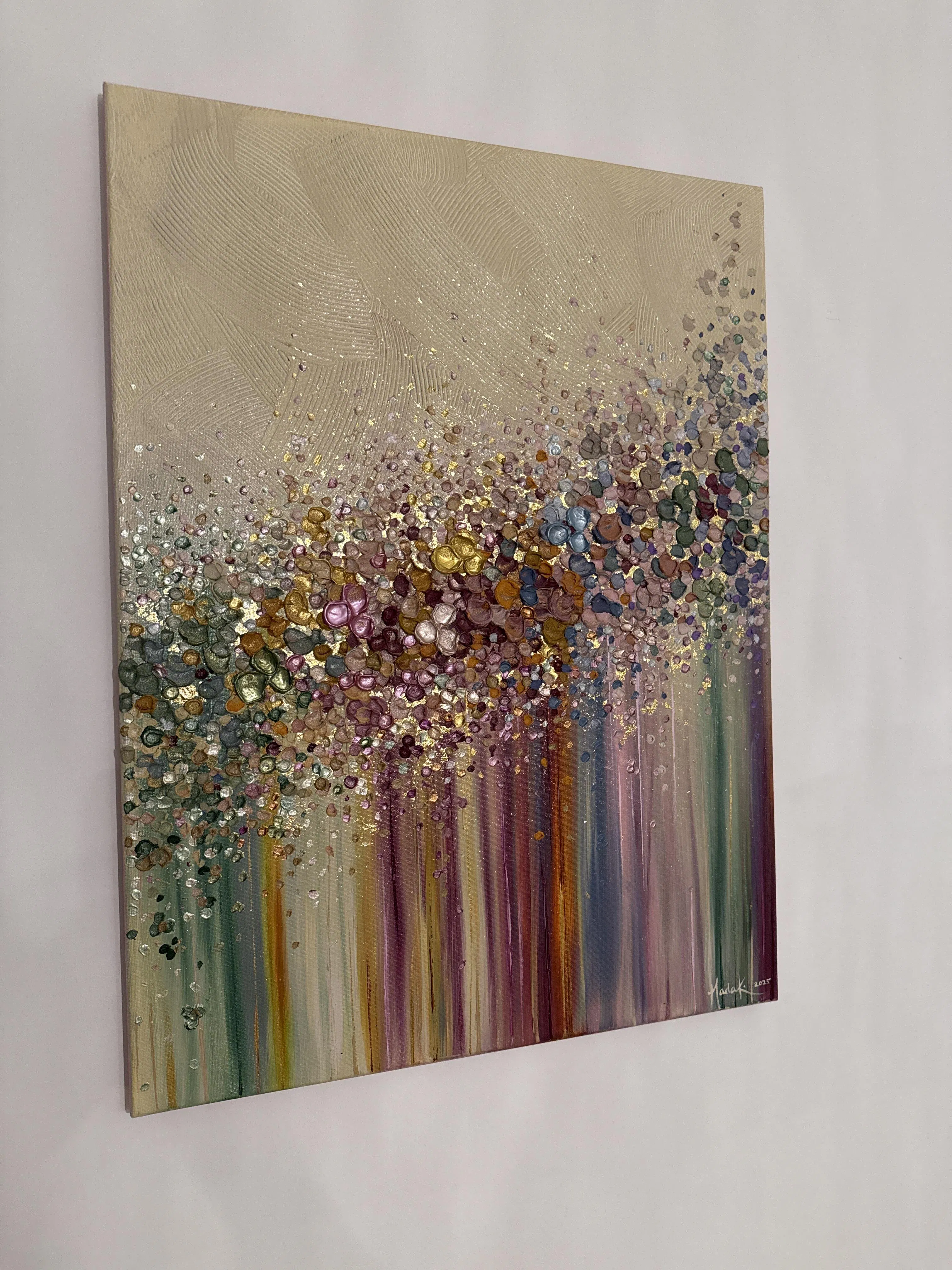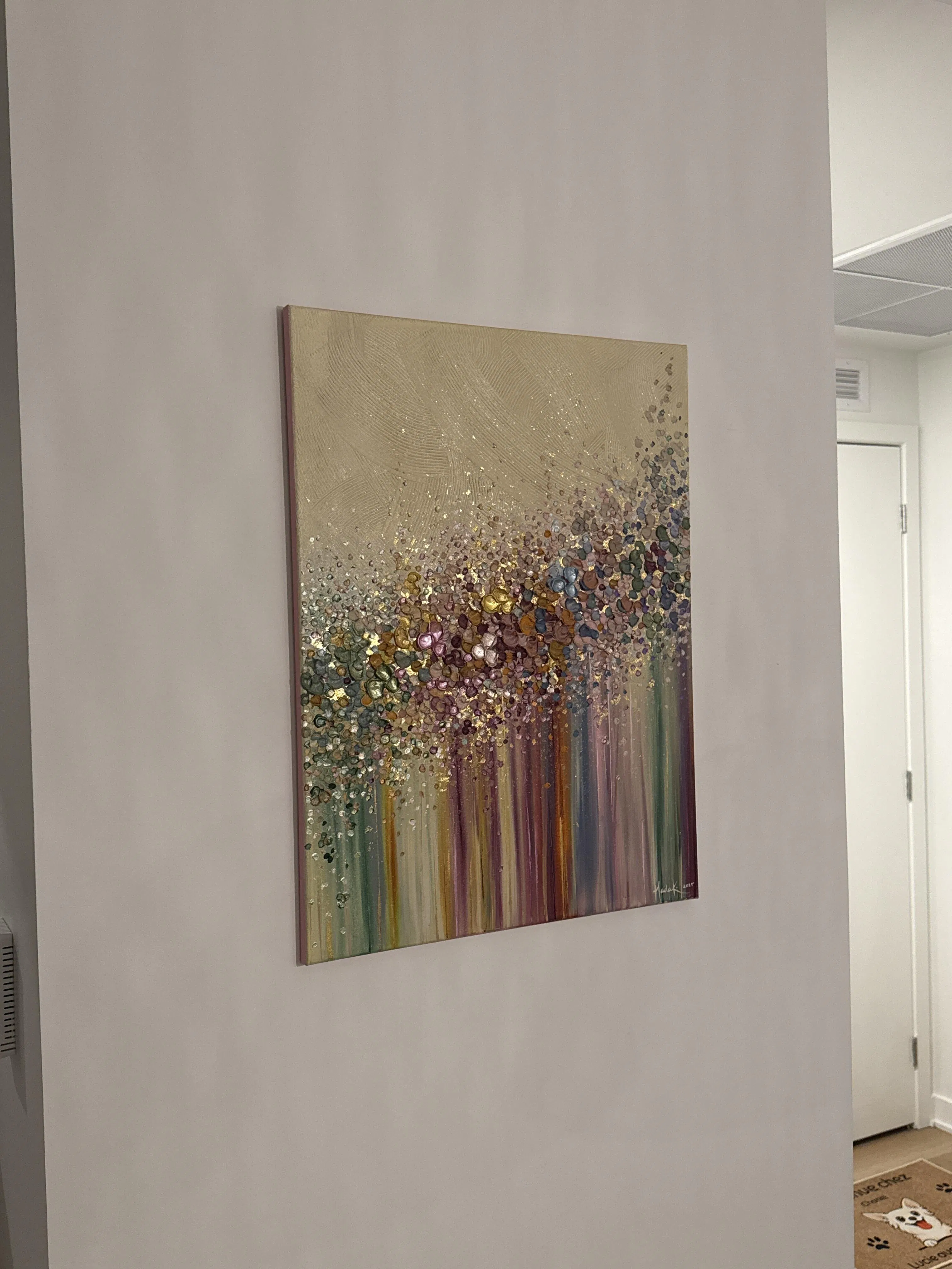 It’s even more beautiful than in the picture. I have been looking for artworks for over a year, and never committed to buying any. This piece is me, it makes me happy, and the colors brighten the space. I will definitely be looking Nada’s futur artwork to slowly build a collection.